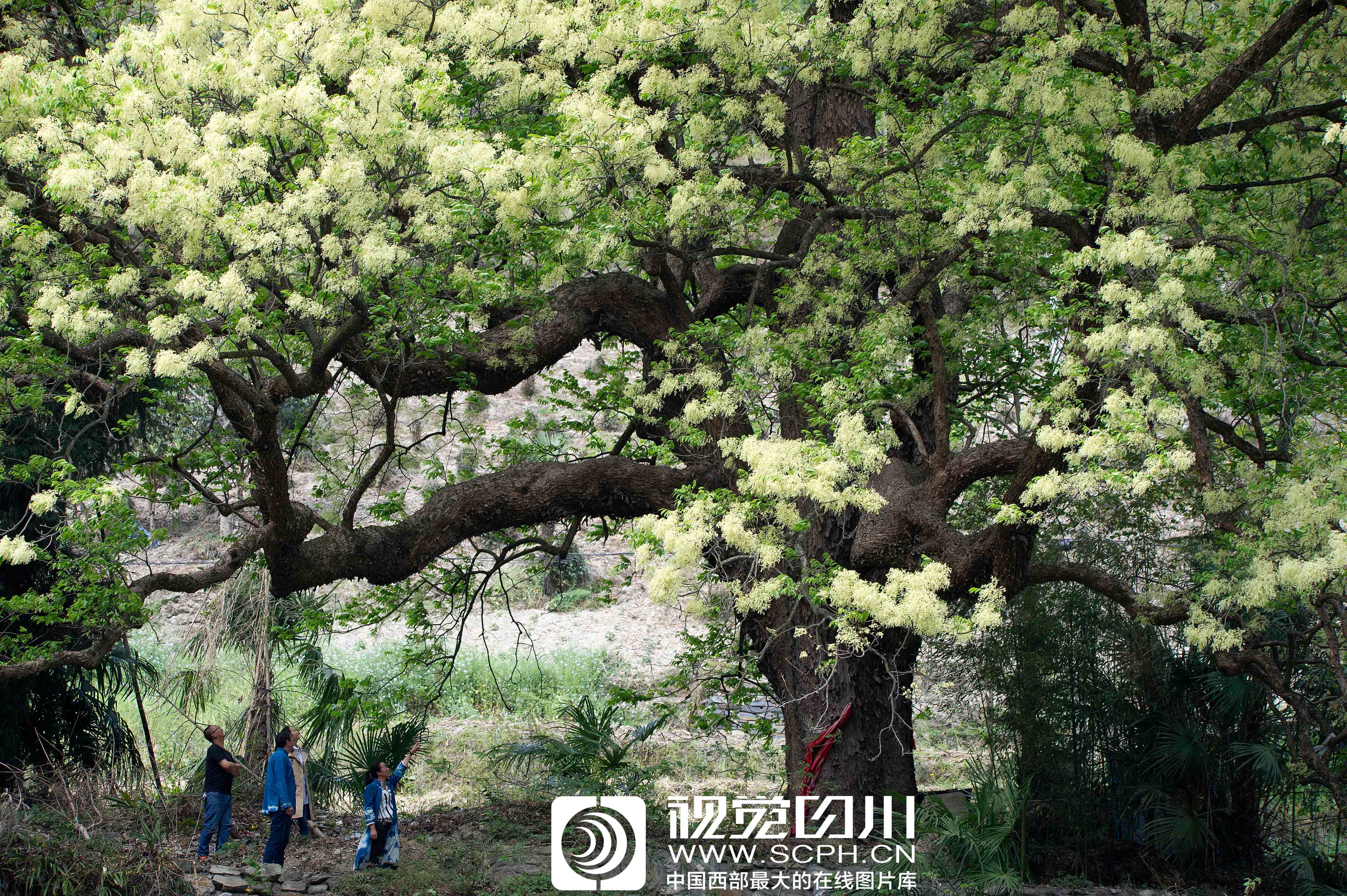 百年之后,原来的拍摄地点已修起了房屋,形成了现在的小村庄。据中科院成都生物研究院研究员印开蒲教授考察得知,目前在西部像现在水晶镇马元村这棵珂楠古树,这么大的很罕见。目前大树的花期已经进入尾声,在五一假期还能见到部分开花的景象。