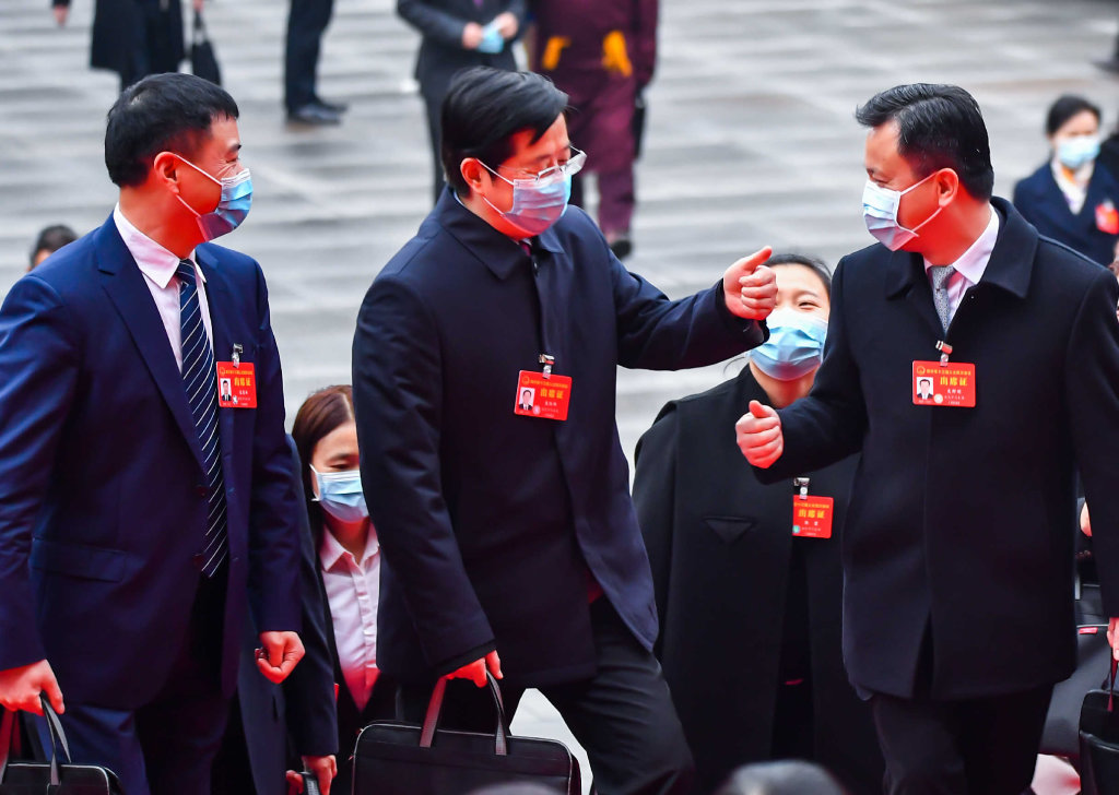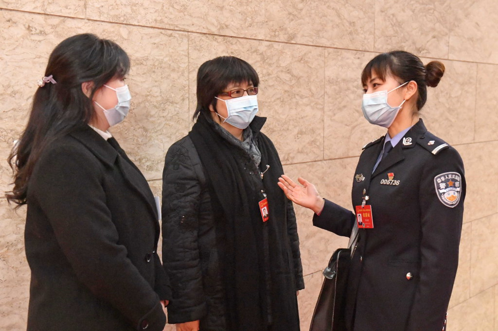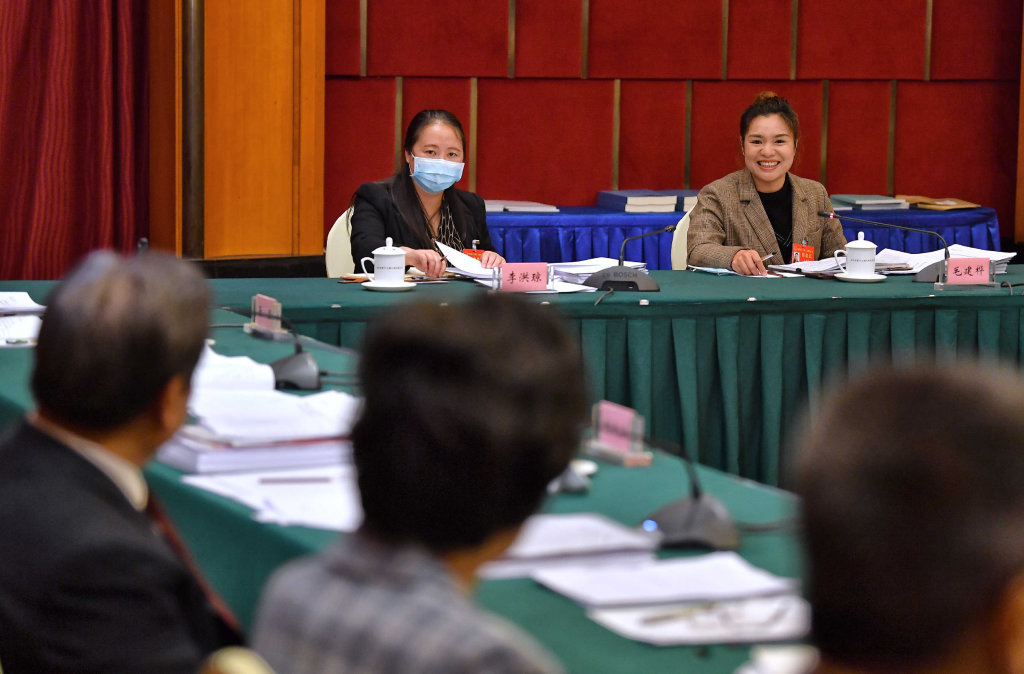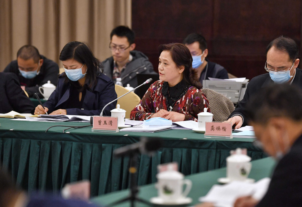 曾玉清代表(中)建议,像保护大熊猫那样保护耕地,促进农业高质高效发展。