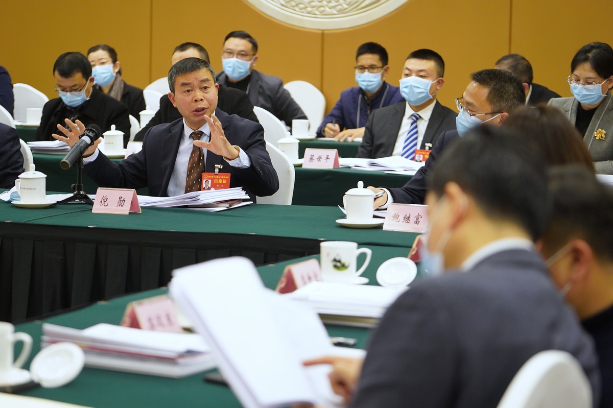 倪勋(左)建议,给予资阳临空经济发展和中国(资阳)牙谷建设项目在政策、资金、用地指标方面更多的支持。
