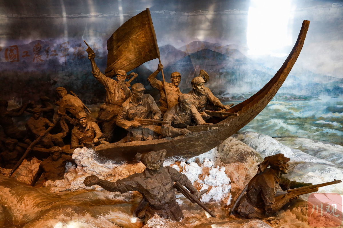 步入中国工农红军强渡大渡河纪念馆,一组宏大的“强渡大渡河”场面展现在眼前,一张张照片、一件件陈列品、一幅幅地图,桩桩件件都在诉说着这段红色记忆,将我们带回1935年的那段峥嵘岁月——