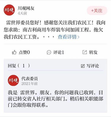 江先生的留言当天通过“你点题,我代言”活动“抵达”雷世界委员手上。很快,雷世界委员向川观新闻记者了解了相关情况及网友联系方式,随后,他表示已将江先生和另一位讨薪网友的求助转发至省人社厅相关部门。