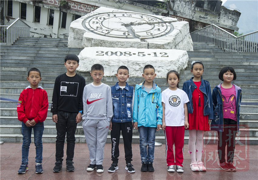 8个孩子站在汶川县映秀镇漩口中学遗址前,