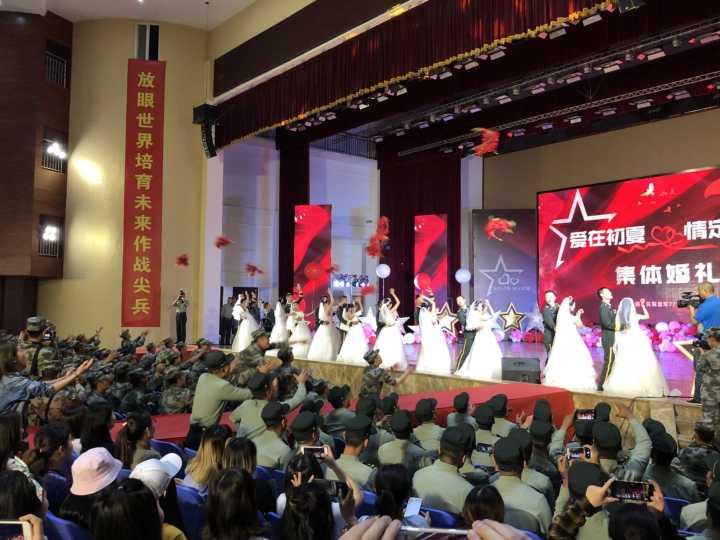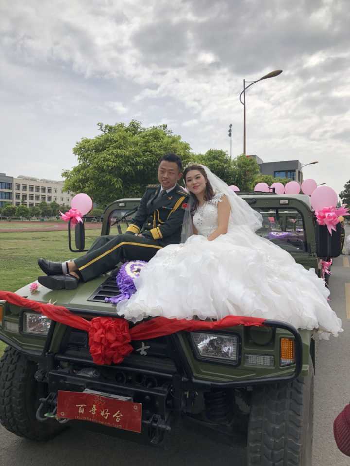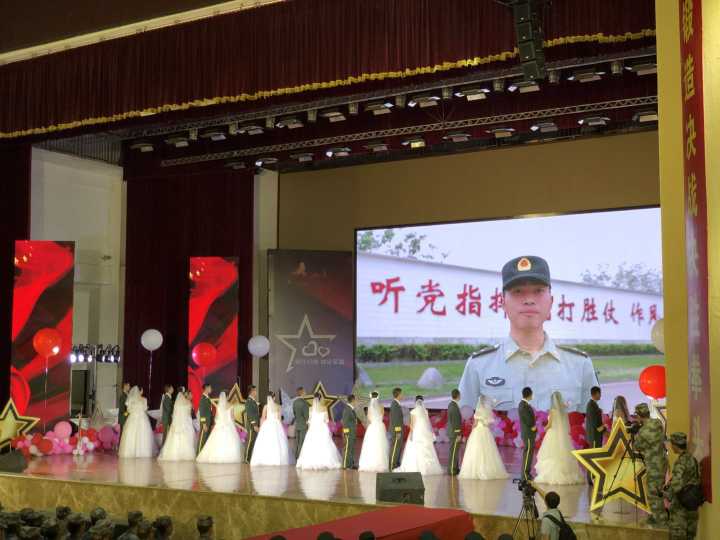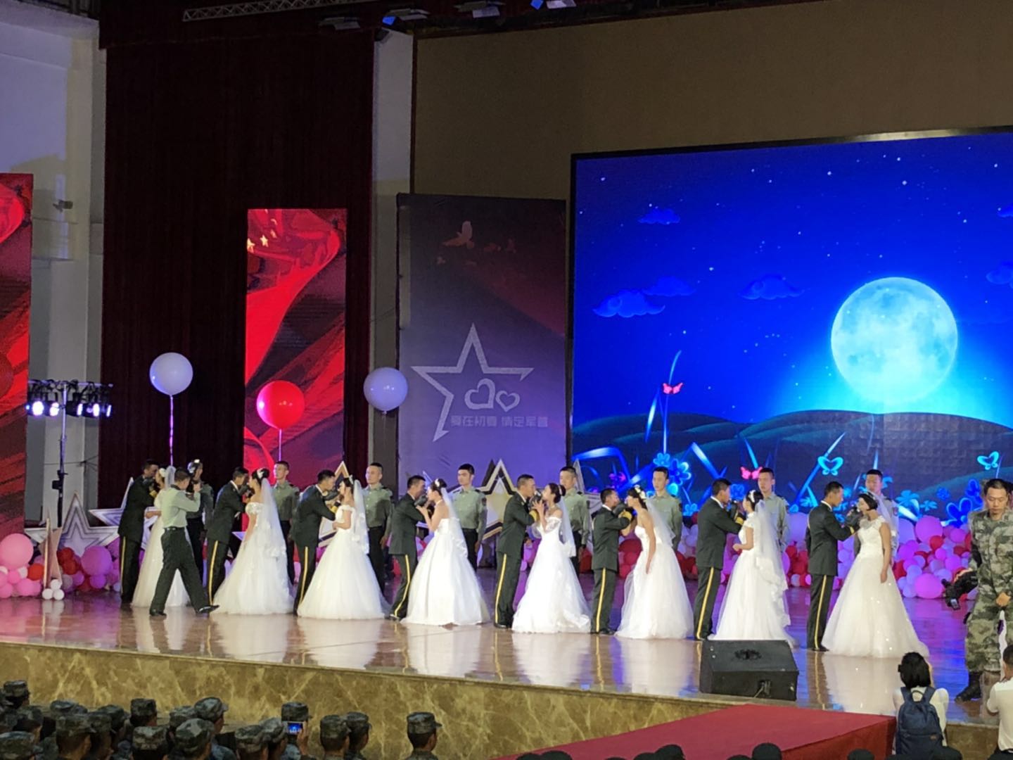 77110部队素有“西南猎豹”的美誉。早上8点30分,10辆威武的军车载着新郎和新娘在军营里帅气亮相,10对新人在战友们的掌声中缓缓步入礼堂。