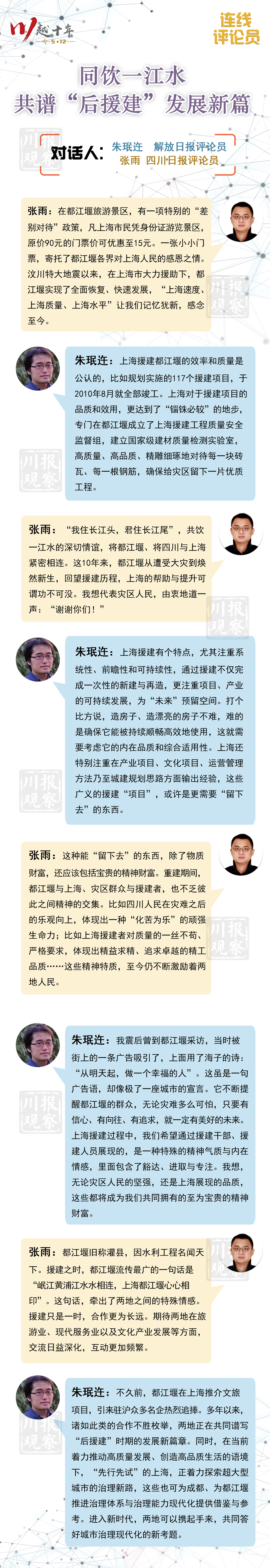 7日起,我们将和北京日报、大众日报、解放日报、新华日报、重庆日报、浙江日报、香港大公报、南方日报、人民日报等9家媒体一起,用连线评论员的方式,在一场场对话中碰撞观点、形成共识,共同梳理灾后重建发展的成功经验,一起重温对口援建的感人点滴,以此表达对社会各界的深深敬意。