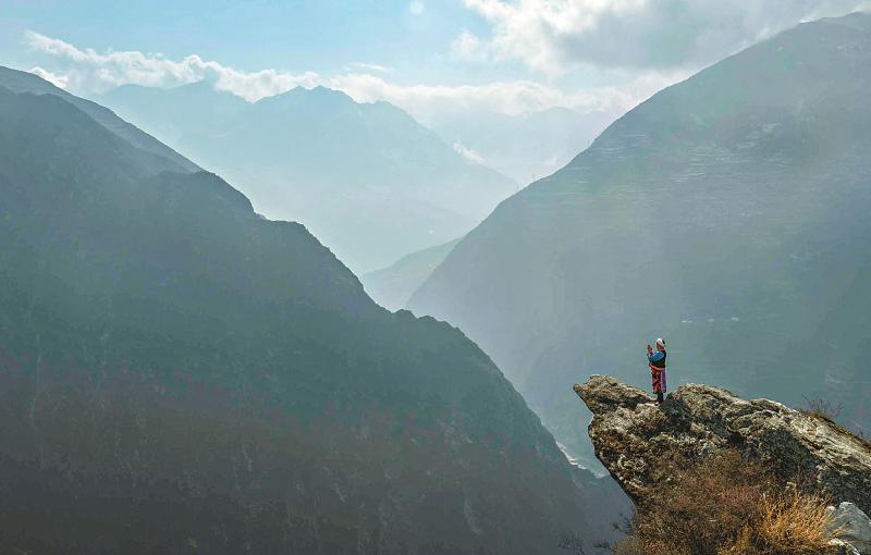 羌历新年,羌族同胞在汶川县鹰嘴岩上为远方的亲人祈福。