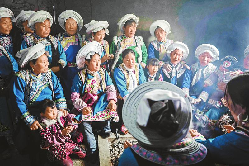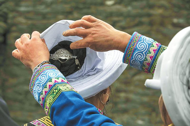 茂县高山羌寨的羌族妇女相互整理头饰。