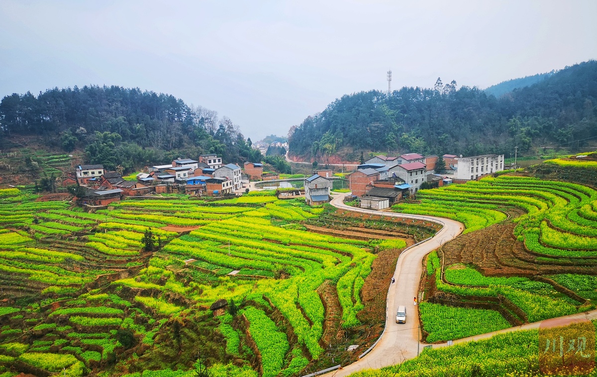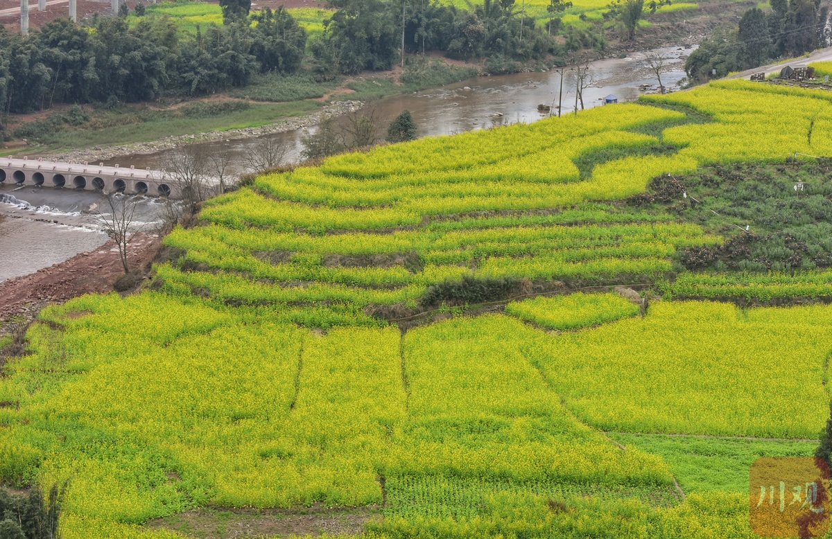 2021年2月3日是二十四节气的立春,而宜宾市屏山县中都镇的油菜花已经进入盛花期,大山像是被画笔涂上了金黄色,早已春色满眼。由于当地特殊的地理气候,这里菜花盛开的时间比同纬度地区提前许多,花期可以从11月末持续至来年3月。
