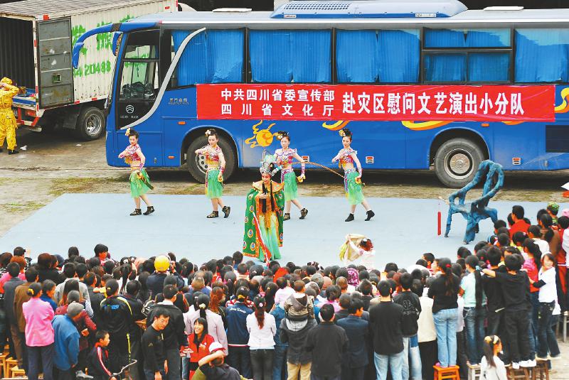 从2008年5月17日起,四川交响乐团演出队伍分别在北京国家大剧院、世纪剧院和深圳音乐厅上演了“众志成城 抗震救灾 重建家园”大型交响乐主题晚会,唤起华夏同根的同胞之情,诉说抗震救灾的感人之声。同时,多支文艺小分队开往灾区,分赴茂县、北川、雅安、崇州、广元、什邡、广汉、安县、绵阳、都江堰等地震重灾区演出,历时半月,行程2000多公里,演出20余场,观众达数万人次。5月下旬,文化部组织10名全国知名剧作家深入四川灾区体验生活,围绕伟大抗震救灾精神进行创作,并组织首批艺术家小分队深入灾区,为灾区群众慰问演出,疏导心理,提神鼓劲。