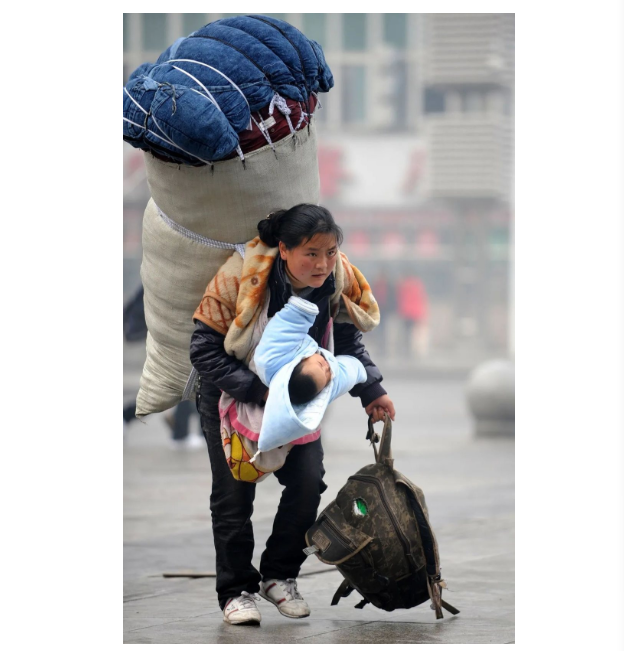 2010年春运,一张照片火遍了全国:南昌火车站,一位年轻母亲被超大的行囊压弯了身躯,她手里的双肩背包眼看拖地,但揽在右臂中的婴孩整洁而温暖。