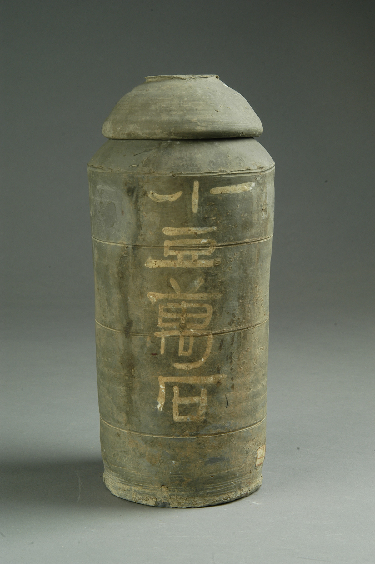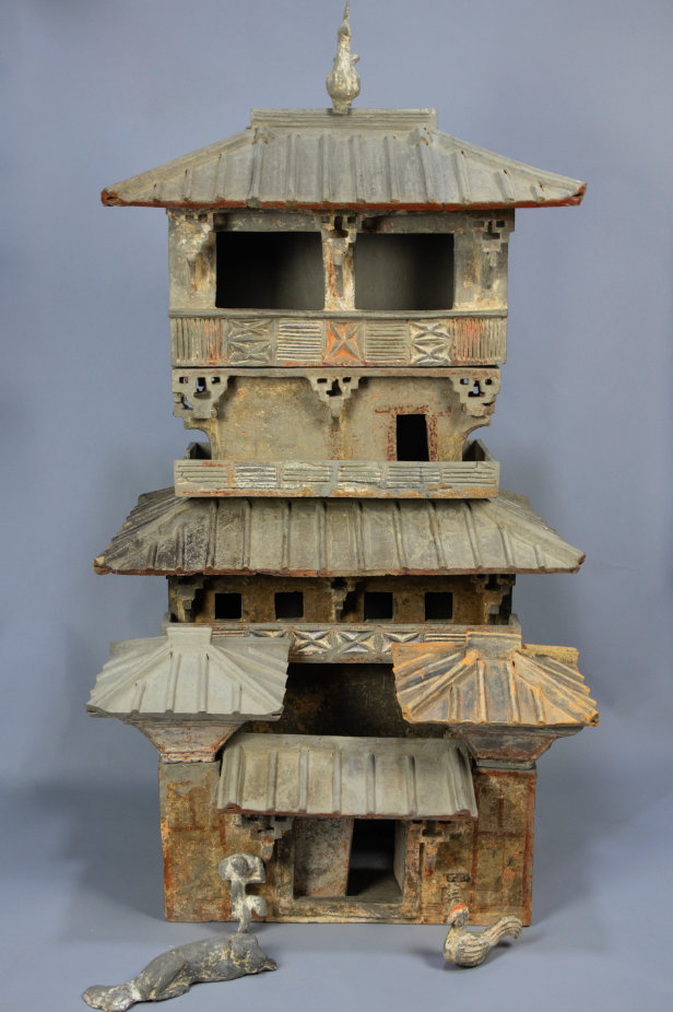 这是一座可拆卸组装的五层陶仓楼模型。楼前有一长方形院落,前墙中部有可开合的双开门,大门口有卧犬一只,有两个人正沿墙行走,正要步入前院之中。一、二楼的粮仓高大方正,开有四个窗口通风,出土时仓室内还残存一些谷物。三层以上的楼房雕梁画柱,层层叠叠的斗拱、装饰精巧的门窗与回廊、宏阔大气的庑殿顶清晰可见,生动再现了汉代高等建筑的风格。整栋楼房以红、蓝、青等色彩绘制出树木、凤鸟、几何纹样等精美图案,端庄粲然。楼上一人凭窗远眺,悠然闲适。根据人物的大小比例,这座五层高楼的仓楼复原高度可达1.45米,应该是当时少见的地标建筑了。