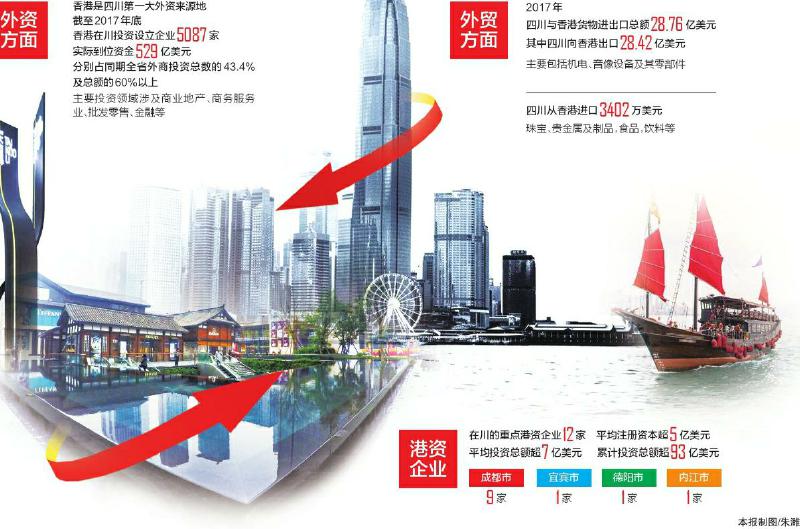 不仅在川港企数量激增,两地贸易总额也在增长。2017年,四川与香港货物进出口总额28.76亿美元,其中四川向香港出口28.42亿美元,包括机电、音像设备及其零部件等;四川从香港进口3402万美元,含珠宝、贵金属及制品等。