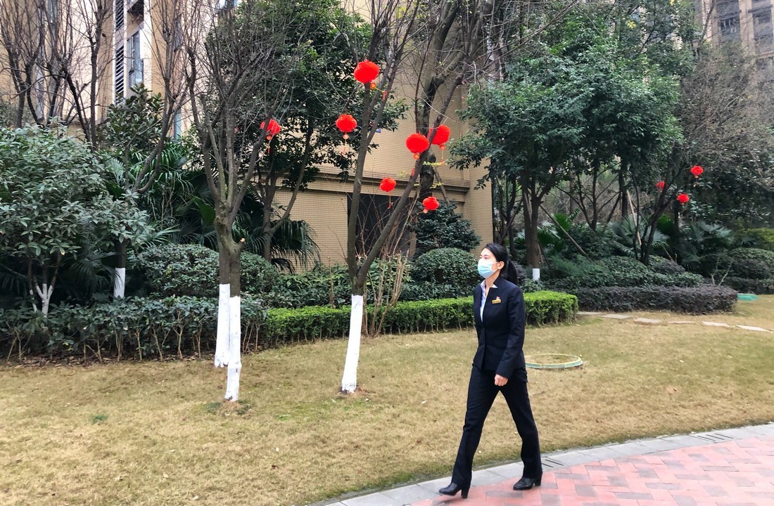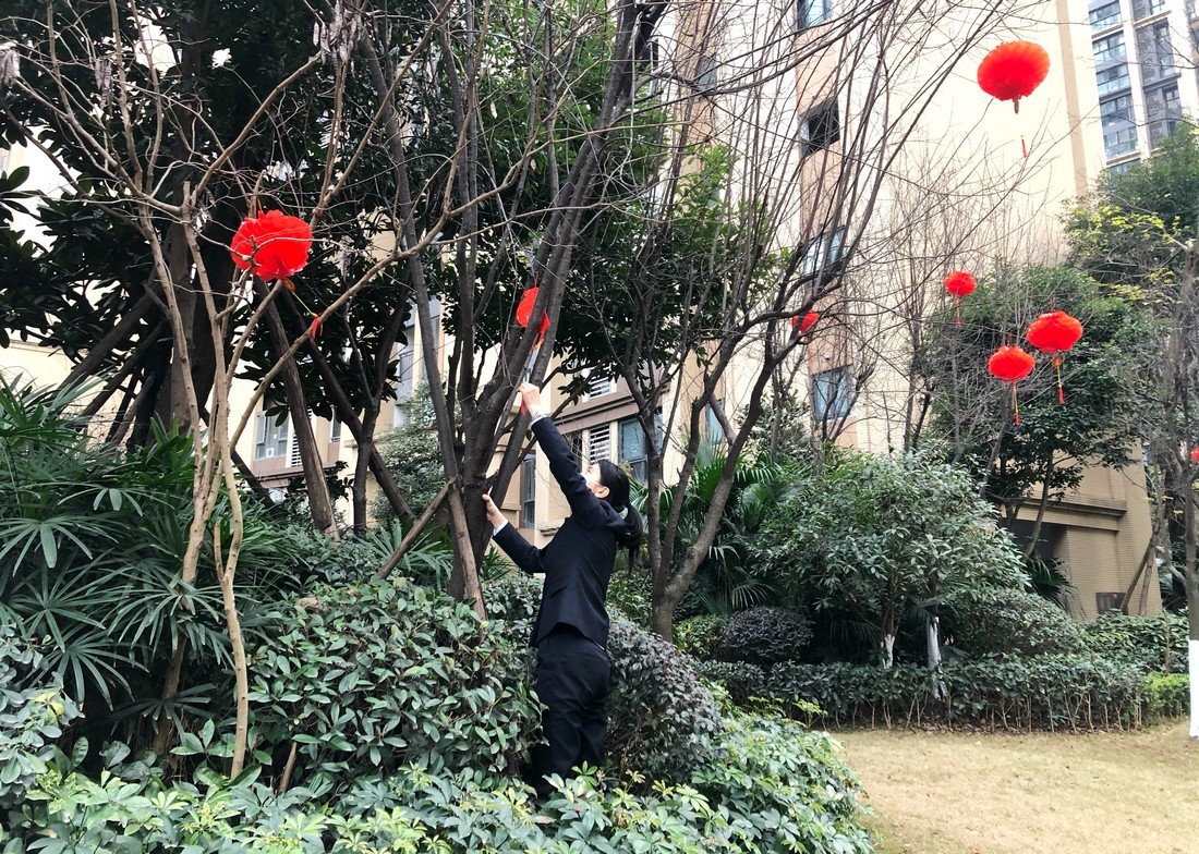 2月1日,记者一走进位于成都高新区的蒂梵尼小区时就看到红彤彤的灯笼已挂满枝头,随风摇曳,浓浓的年味扑面而来。蒂梵尼小区项目经理何钰铧正在检查小区氛围布置情况,一路上,她不时热情地与业主打着招呼。何钰铧告诉记者,2020年春节她是在小区度过的,今年,她还会坚守在小区,就地过年。