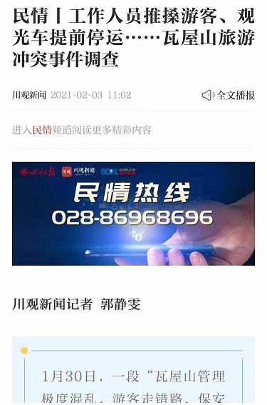 近日,一段“瓦屋山管理极度混乱,游客走错路,保安直接打游客”的视频在网上发布,迅速引发数万网友关注。民情热线记者对此展开调查,景区称其工作人员确实与游客发生推搡行为,双方情绪都比较激动,后经调解已达成和解 <<<点击阅读此前报道