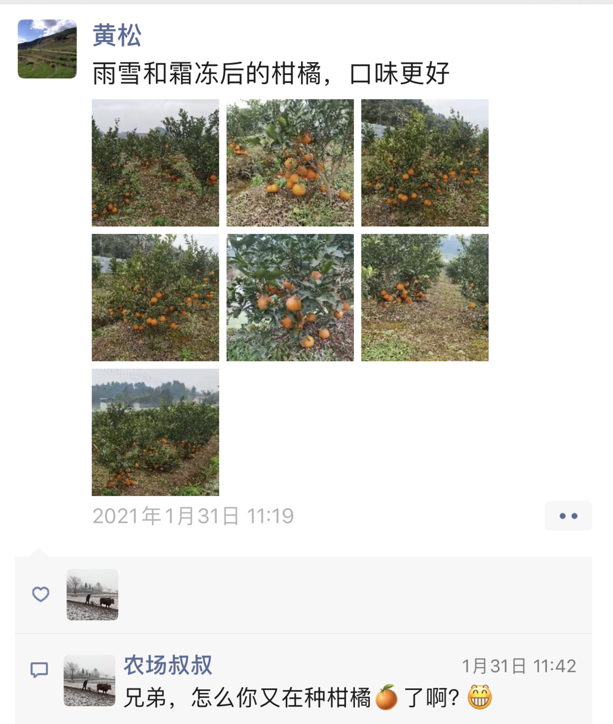 “雨雪和霜冻后的柑橘,口味更好”“有需要的可以预订了”!这段时间以来,简阳市种粮大户黄松接连在朋友圈打出推介柑橘的“广告”。