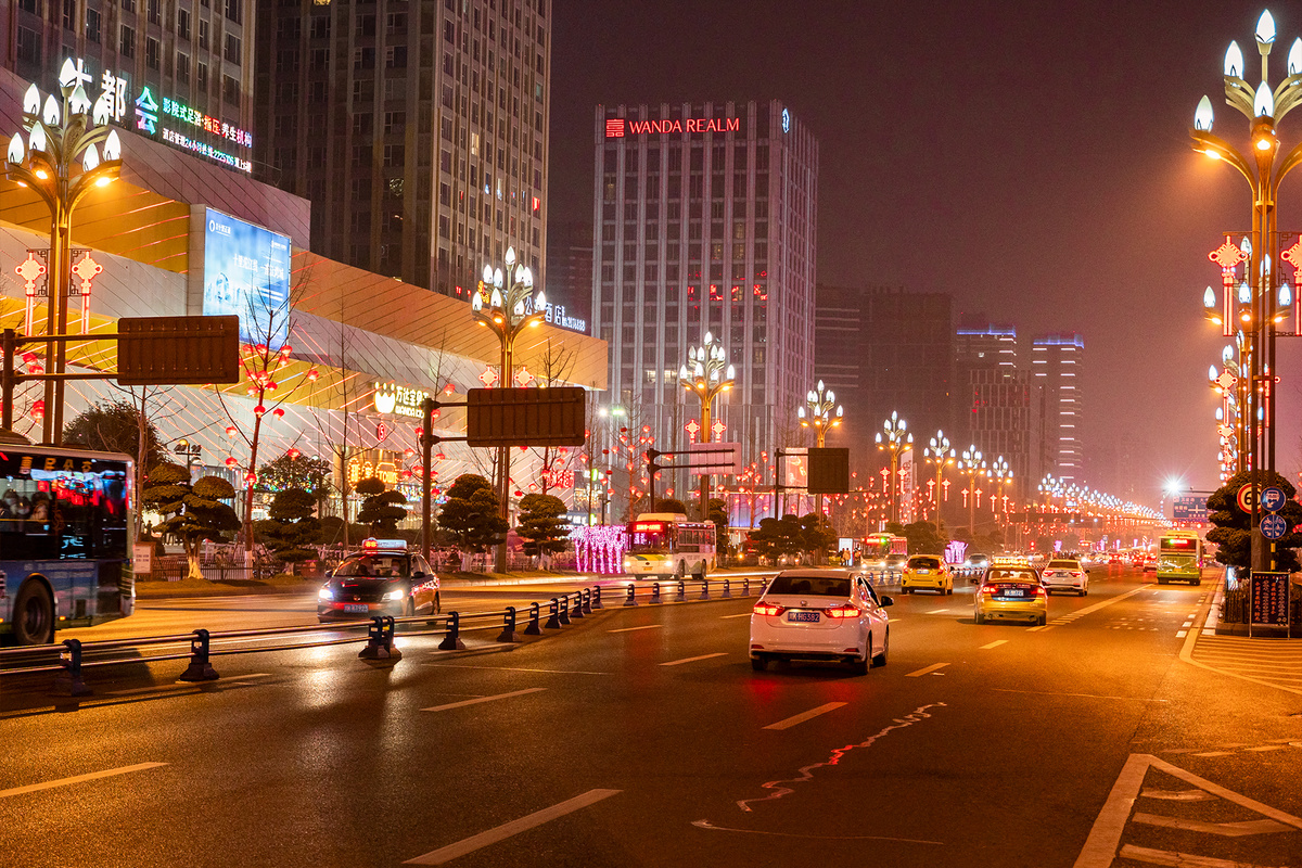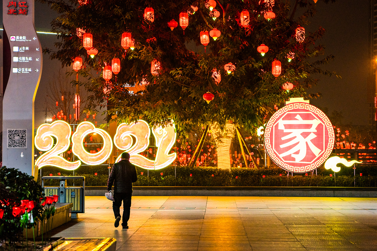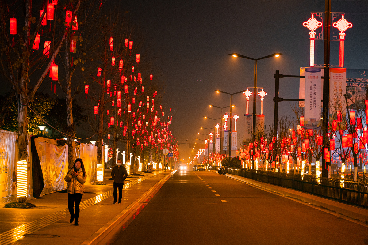 五彩的满天星、鲜红的“福”字、亮丽的中国结、火红的灯笼……距离大年三十仅剩一周,此时内江街头过年的气息也越来越浓厚,城区的街道在彩灯的装饰下流光溢彩,树上缠绕着灯串,树与树之间用灯带连接,整座城市被各种彩灯完全点亮。