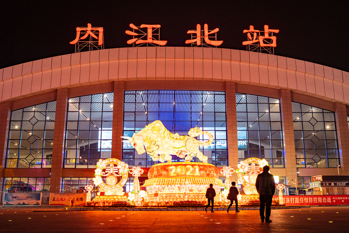 2月4日晚,随着街头彩灯缓缓亮起,行走在内江城市中轴汉安大道上,只见一路火树银花,两侧的行道树上挂上了成串的灯笼和中国结,在夜色中熠熠生辉,当晚七点半,刚从成都乘坐动车返回内江的胡女士一出高铁站,就发现站前广场上矗立着一座主题为“牛年大吉”的亮化景观,赶忙拿出手机拍照并感叹道:“看着太喜庆了,每年春节印象最深的就是我们内江的彩灯,非常漂亮,尤其是汉安大道上,一路都是红红火火的。”