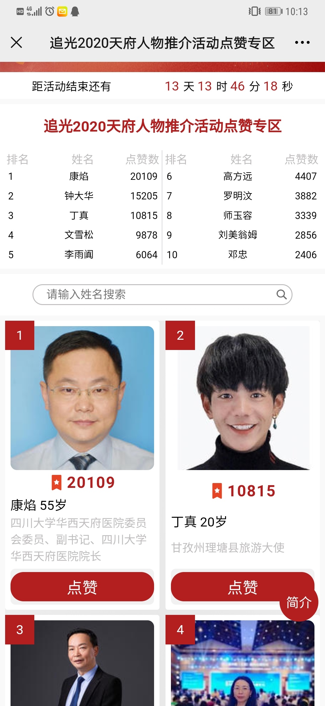 “追光2020”天府人物推介活动候选人点赞环节仍在继续,赶快拿起手机为他们加油点赞吧!
