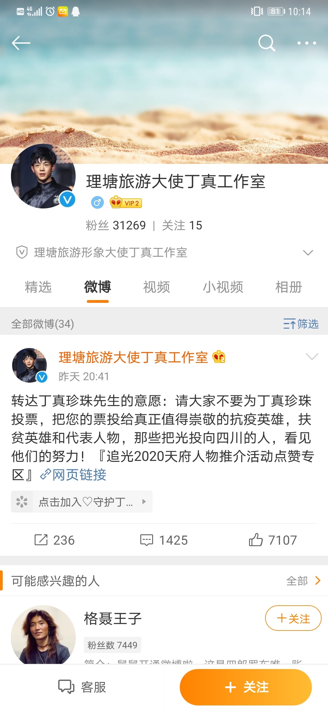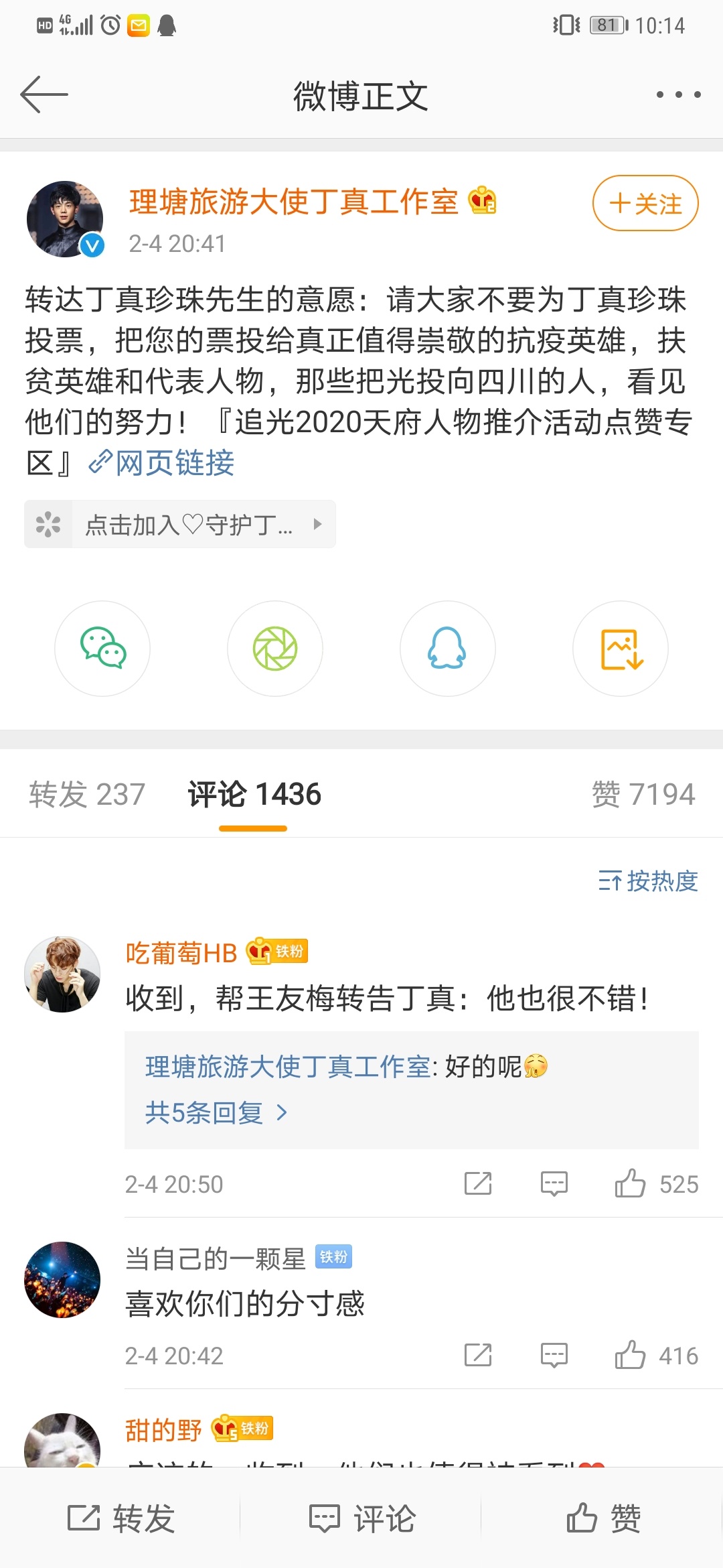 2月4日晚上8点41分,丁真就通过“理塘旅游大使丁真工作室”在新浪微博紧急呼吁“别投我”,并请大家把关注“送给真正值得崇敬的抗疫英雄,扶贫英雄和代表人物”。