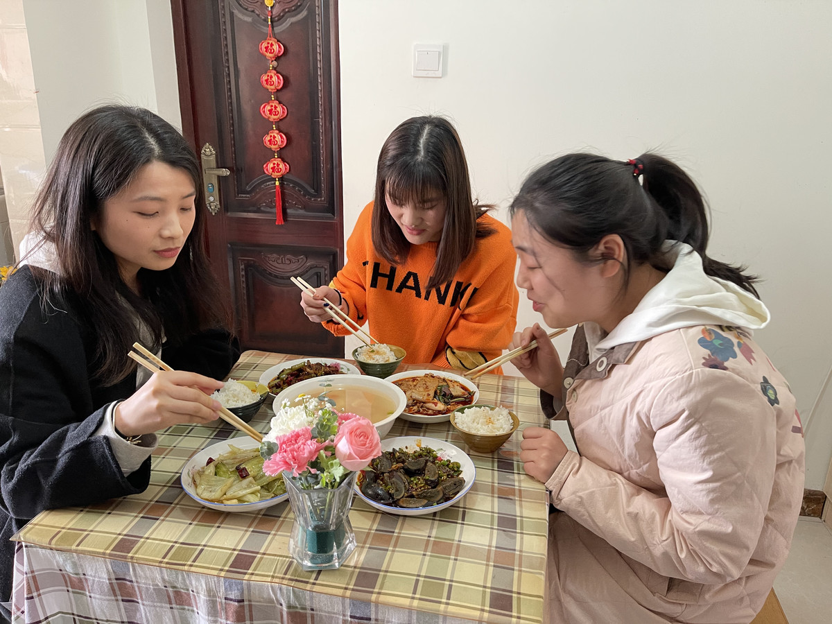 “菜齐了!来,开动!”端上精心准备的最后一道菜,钱梦珍轻松地落座,和两位“小姐妹”——赵月、王永敏开心地用起餐来。