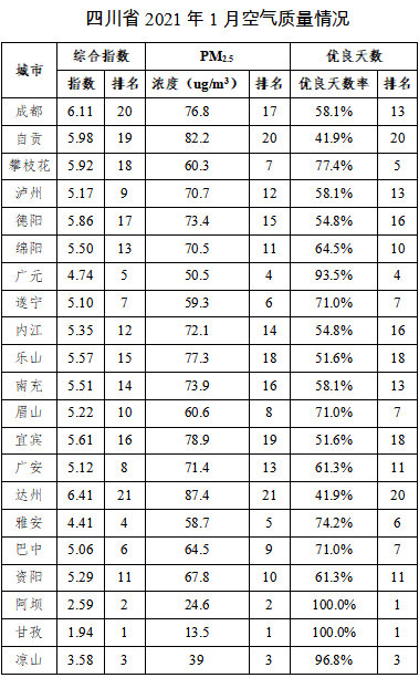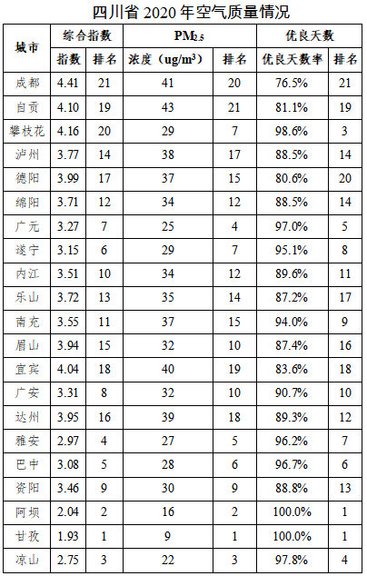 2月7日,四川省生态环境厅通报了2020年和2021年1月全省各市州空气质量状况。根据通报,去年甘孜州和阿坝州的空气质量优良天数率为100%,并列全省第一,而成都市和德阳市的空气质量优良天数率,则排名最后两位。