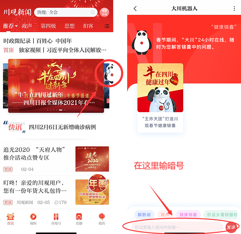 第一步:打开川观新闻客户端,点击右上角“大川”熊猫图标,进入“大川”机器人互动页面。