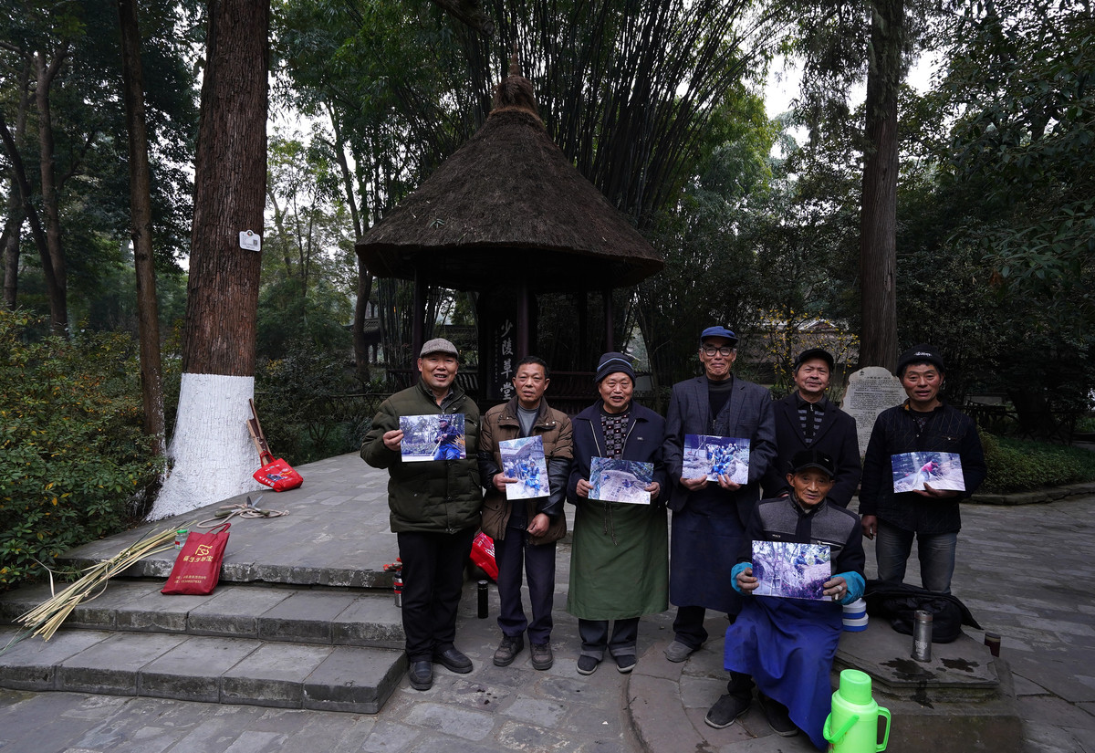 1月24日,周礼春(左一)和他的老伙计们在今年草堂茅屋修缮完工后拍了这张合影,大家手中拿着的照片是他们6年前在草堂修缮茅屋时的场景照。