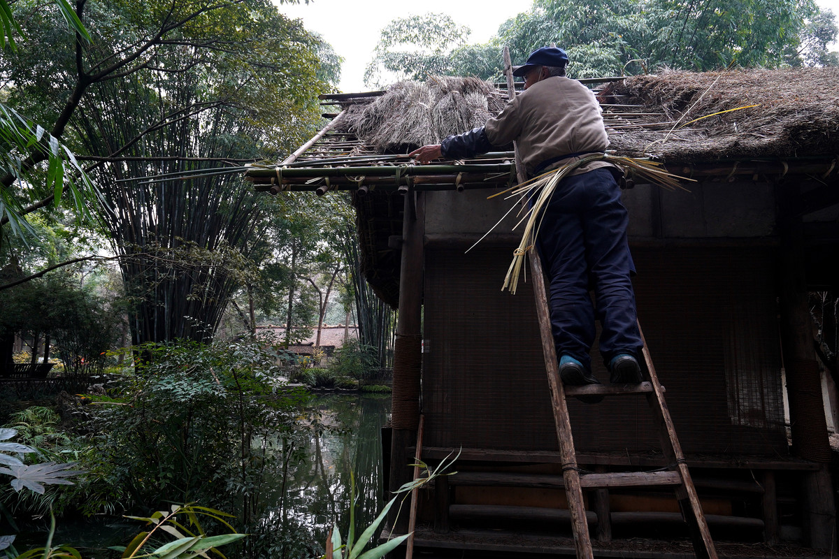 杜甫草堂自1996年重建茅屋后,通常每隔10年需要整体换草,每两年需局部整修。杜甫草堂茅屋修葺工匠,是来自郫都区的一群民间手艺人。过去,为人们修盖草房的工匠被称作“盖匠”。搭房檩、削篾条、铺茅草,盖茅草屋工序繁琐,需要多年学习才能熟练掌握。如今茅屋越来越少,盖匠也逐渐淡出人们的视线,茅屋修葺人寥寥无几,传统手艺面临失传。