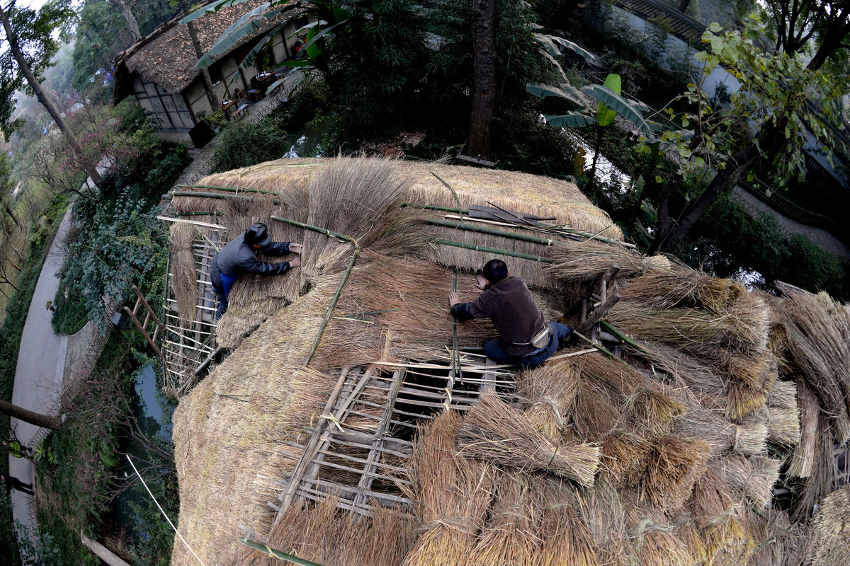 2015年1月20日,成都草堂茅屋翻新时的场景。