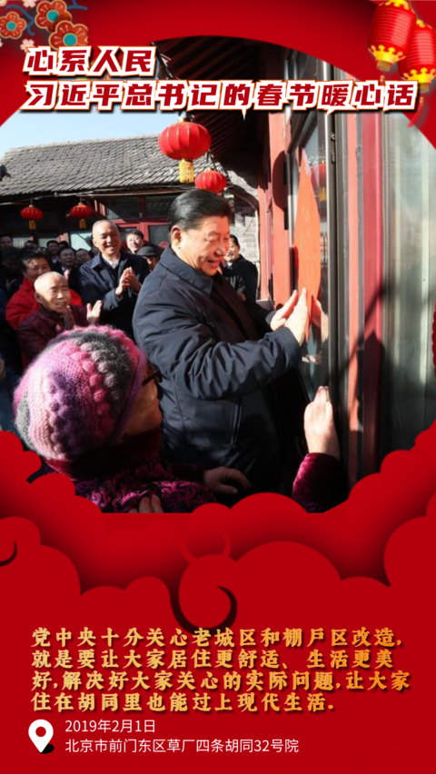 2019年除夕将至,习近平总书记在北京深入机关、社区、冬训中心考察调研,给基层干部群众送去党中央的关心和慰问,向全国各族人民致以美好的新春祝福,祝各族人民幸福安康,祝伟大祖国繁荣吉祥。