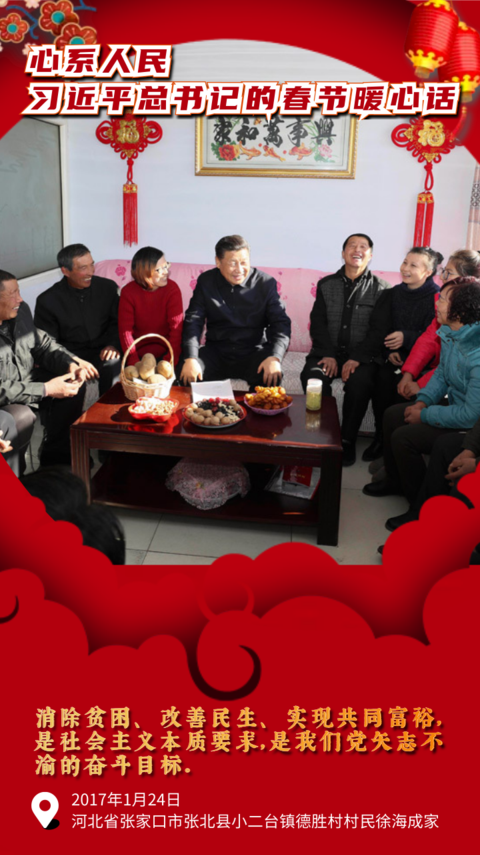 中华民族的传统节日——农历鸡年春节来临之际,习近平总书记来到河北省张家口市,看望慰问基层干部群众,考察脱贫攻坚工作和北京冬奥会筹办工作,向全国各族人民致以美好的新春祝福,祝伟大祖国更加繁荣昌盛,祝各族人民更加幸福安康。