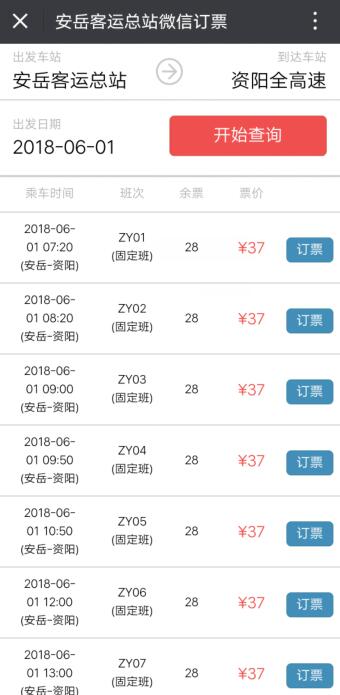 随后,记者从安岳客运总站了解到,“安岳出行”微信公众号上已开通安岳到资阳(资阳全高速)网上购票,发车时间为 7:20—17:40,固定12班。为方便乘客出行,从安岳老城区出行的乘客,可直接在解放桥便民服务站购票乘车,城南及宝森柠檬小镇周边的乘客,可直接在成安渝高速公路安岳入口前200米便民服务站购票乘车。