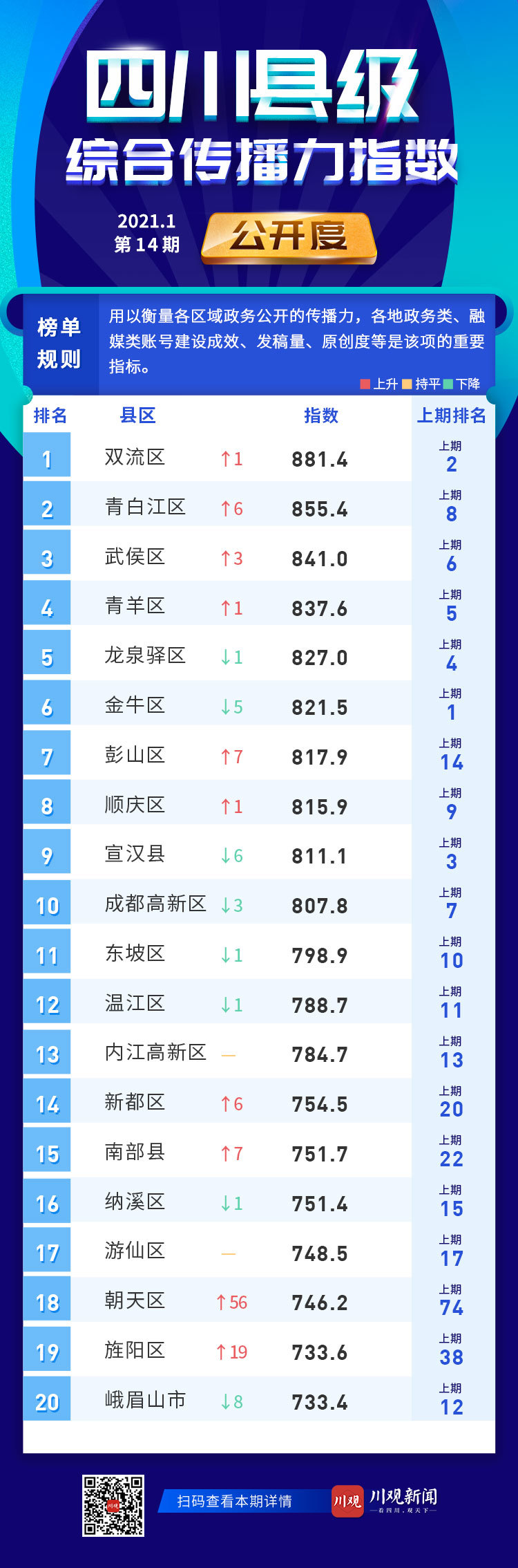 从公开度前20名统计结果看,成都市双流区名列第一;广元市朝天区、德阳市旌阳区排名上升幅度大。