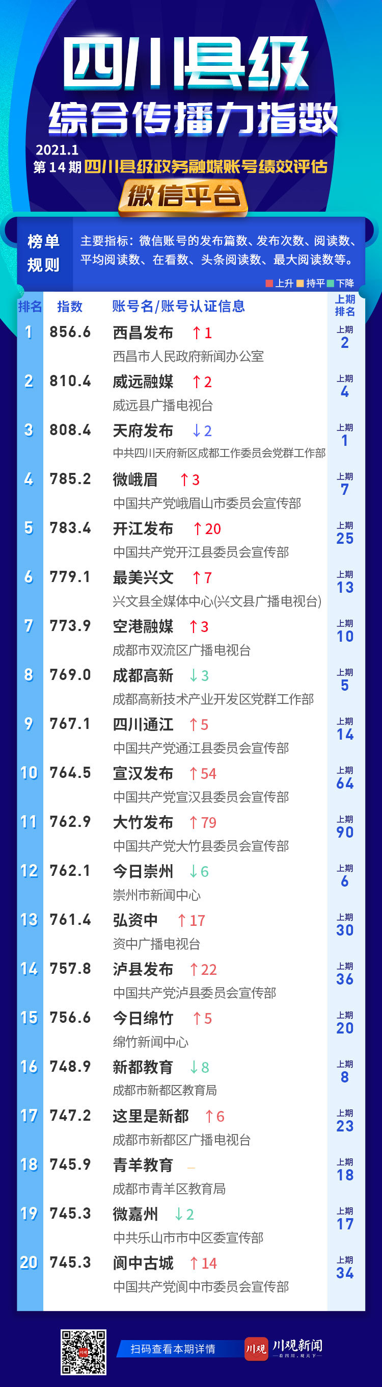 微信平台前20名账号依次是:西昌发布、威远融媒、天府发布、微峨眉、开江发布、最美兴文、空港融媒、成都高新、四川通江、宣汉发布、大竹发布、今日崇州、弘资中、泸县发布、今日绵竹、新都教育、这里是新都、青羊教育、微嘉州、阆中古城。