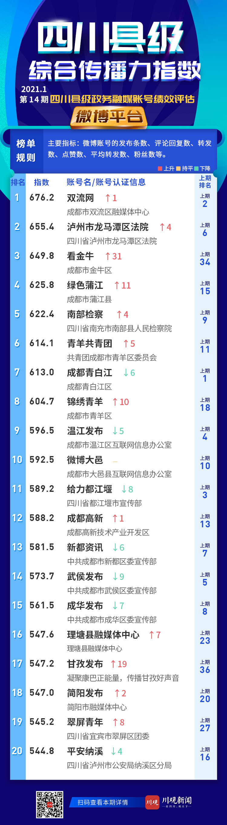 微博平台前20名账号依次是:双流网、泸州市龙马潭区法院、看金牛、绿色蒲江、南部检察、青羊共青团、成都青白江、锦绣青羊、温江发布、微博大邑、给力都江堰、成都高新、新都资讯、武侯发布、成华发布、理塘县融媒体中心、甘孜发布、简阳发布、翠屏青年、平安纳溪。