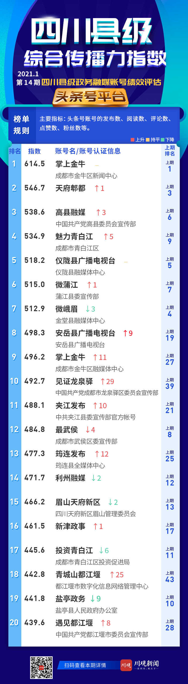 新年新气象,2021年四川县级综合传播力指数的视觉风格也迎来大更新。从功能上讲,指数图优化了排名变化的呈现方式,相较于之前仅对入围区域、账号进行排名对比,新版指数图升级为直接呈现入围区域、账号的上期实时排名,使排名变化幅度更加直观清晰。