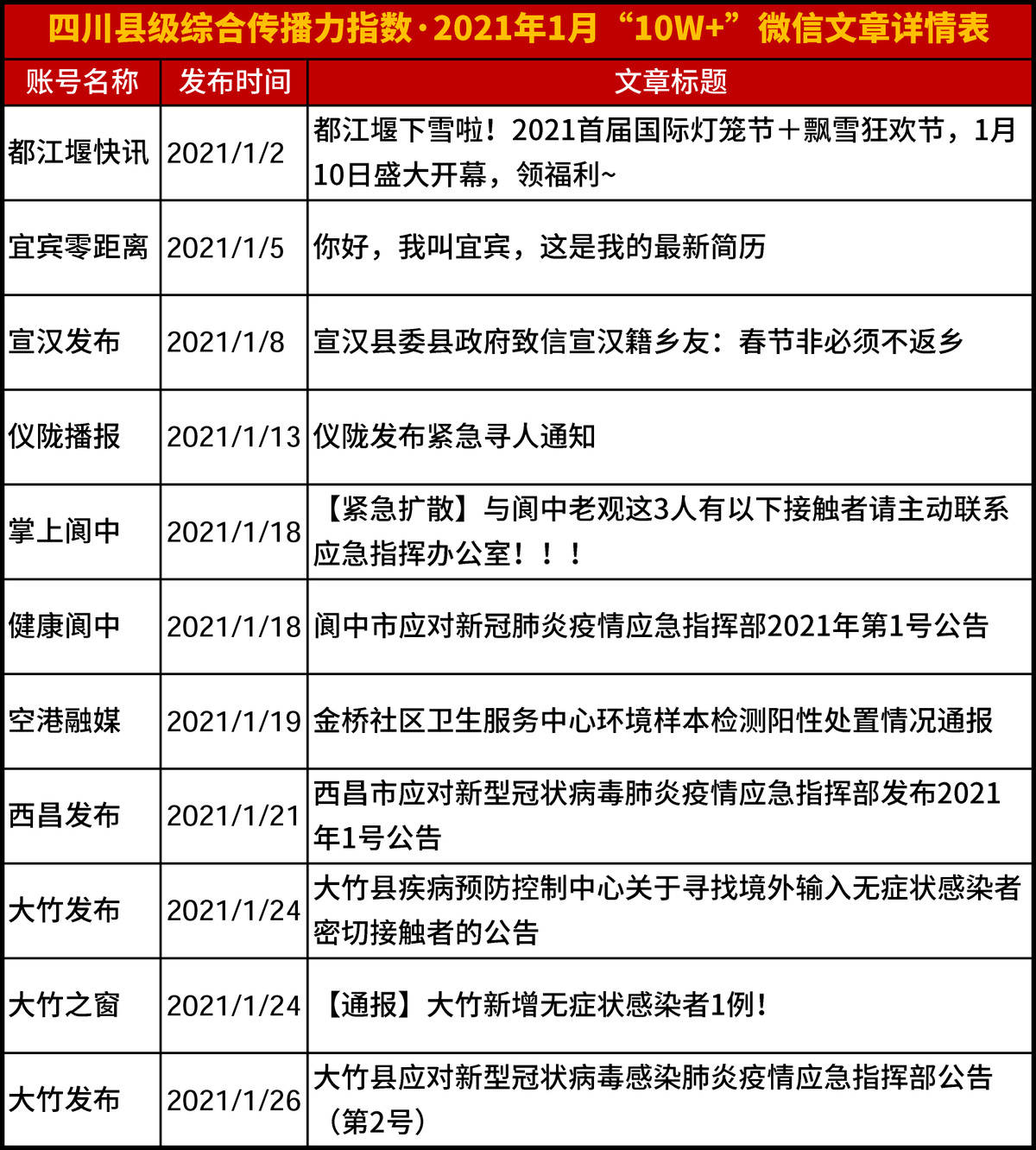 1月,各地春节疫情防控政策备受关注,“返乡人员”“就地过年”“核酸检测”等话题引发热议。从下列“10万+”文章详情统计表(按发布时间排序)中,可看出阆中、大竹等地的政务账号发布的疫情相关资讯,公信力强、触达率高、传播效果好,能较好实现信息传递、舆论引导的作用。