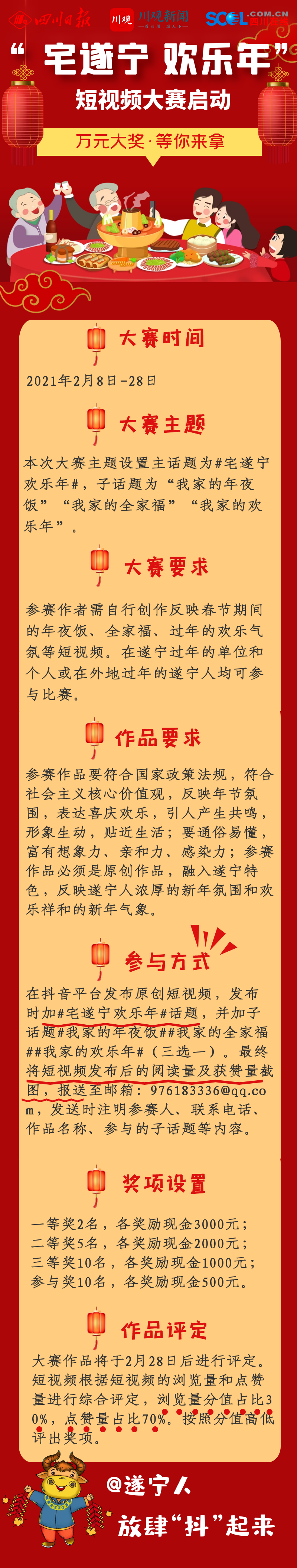 春节近在咫尺,年味儿也越来越浓,火红的灯笼挂满了遂宁大街小巷。这个春节,如果你在遂宁过年,拍摄一段“抖视频”,不但能在抖音上收获无数点赞,还能参加“宅遂宁 欢乐年”短视频大赛,有机会瓜分万元大奖!