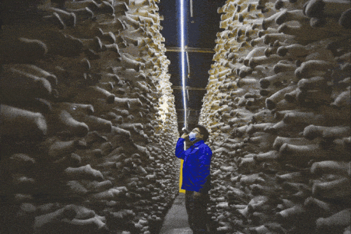成都市郫都区战旗村,自2018年2月12日习近平总书记考察过后广为人知,成了乡村振兴的样本。通过打造观光旅游农业,培育乡村发展新动能,乡村旅游业已成为战旗村的新兴支柱产业。2021年1月24日,战旗村的中延菌业工作人员冯克平正在查看杏鲍菇生长状况。