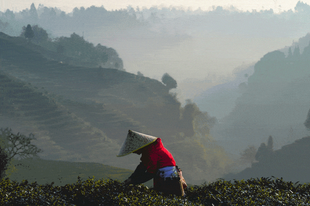 2020年2月29日,雅安市名山区茶乡在蒙蒙晨雾中醒来,晨雾笼罩茶山,茶树透着嫩绿,茶园弥漫茶香。清晨6点,茶农们早早来到茶园里忙碌着,用勤劳的双手采摘着春天的收获。