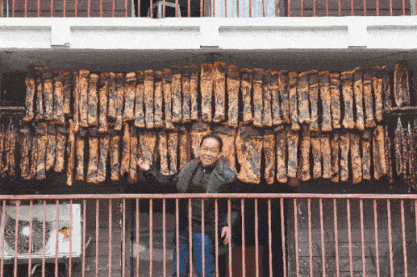2021年1月26日,汶川县映秀镇博爱新村饭店老板杨云刚的阳台上挂满了一方方的川味腊肉,令人垂涎。3年前,习近平总书记到四川视察期间,在杨云刚的邀请下,总书记愉快地参与炸酥肉、磨豆花,其乐融融。
