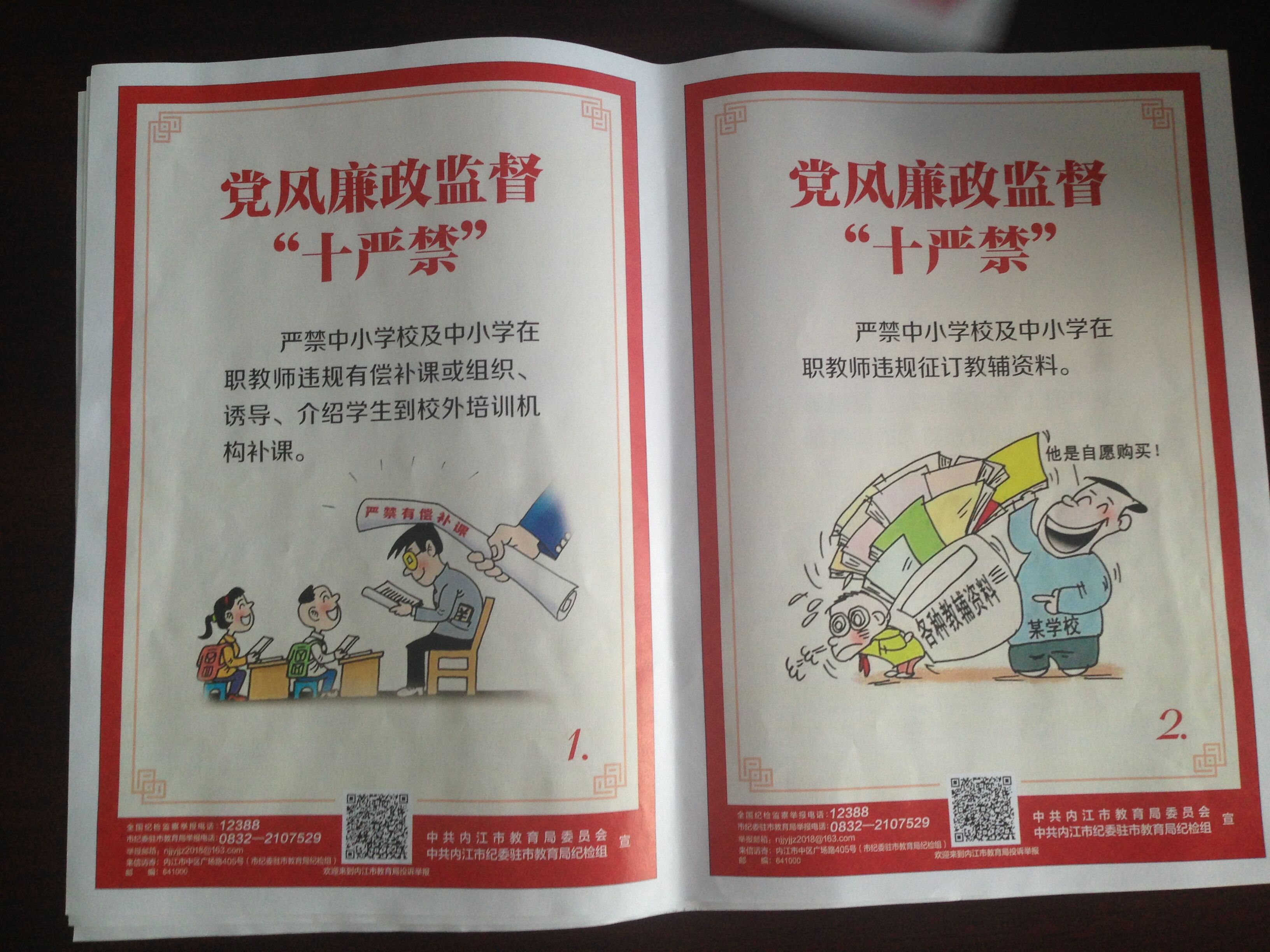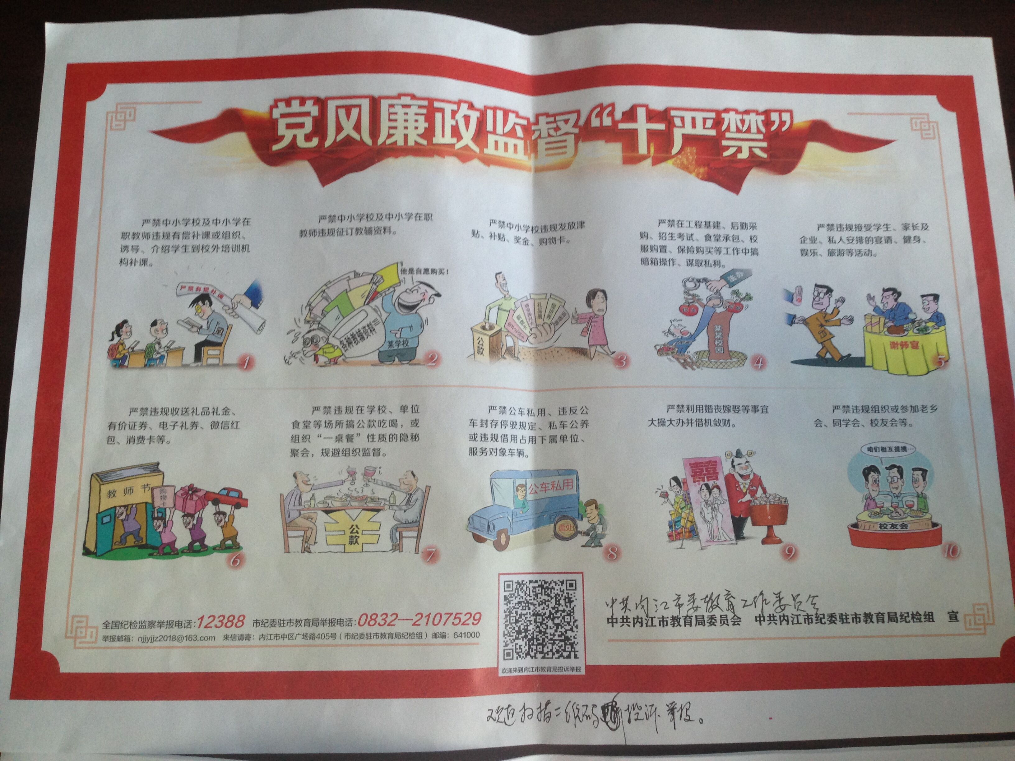 6月5日,在中共内江市纪委驻市教育局纪检组组长、市教育局党委委员郭镔乙的办公桌上,摆着数张教育系统党风廉政监督“十严禁”的宣传资料,它们即将分发并张贴至全市所有中小学校,以图文并茂的形式向教育领域的十大行为说“NO”,并配有投诉举报电话、电子信箱和微信二维码。
