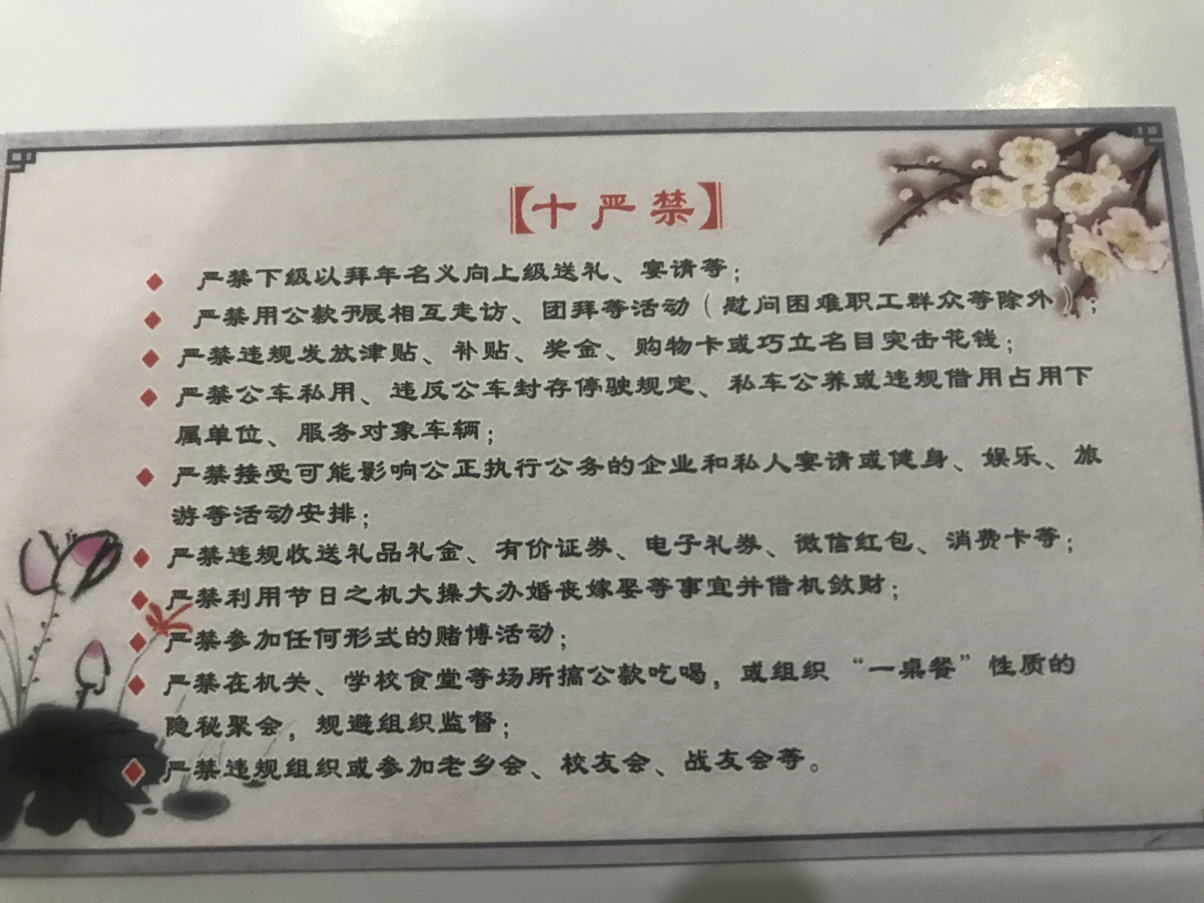 记者注意到,这张“党风廉政监督名片”正面印有市纪委驻内江市教育局信访举报电话、举报邮箱和通信地址、邮政编码;背面印有市委关于“严禁下级以拜年名义向上级送礼、严禁公车私用、公款吃喝、违规发放津贴、补贴、奖金、购物卡等”“十严禁”内容。