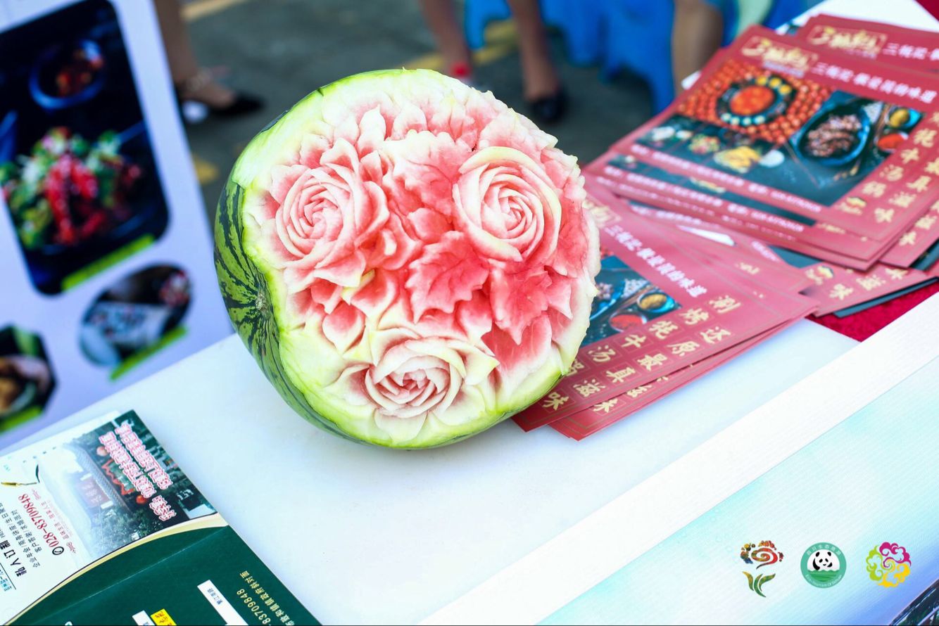 刻刀上下翻飞,不一会,一朵精致的玫瑰雕花便浮现在西瓜上……在开幕式活动现场,市民游客观赏和体验了瓜雕的乐趣。红岩镇种植西瓜的历史近20年,如今引入社区社会组织成都市集体社会实验室,在塔桥村红塔小区为试点,开展“玩一手、露一手、学一手”为主题的村民活动,如今村里举办了瓜雕培训班,让西瓜不仅好吃,还好看。