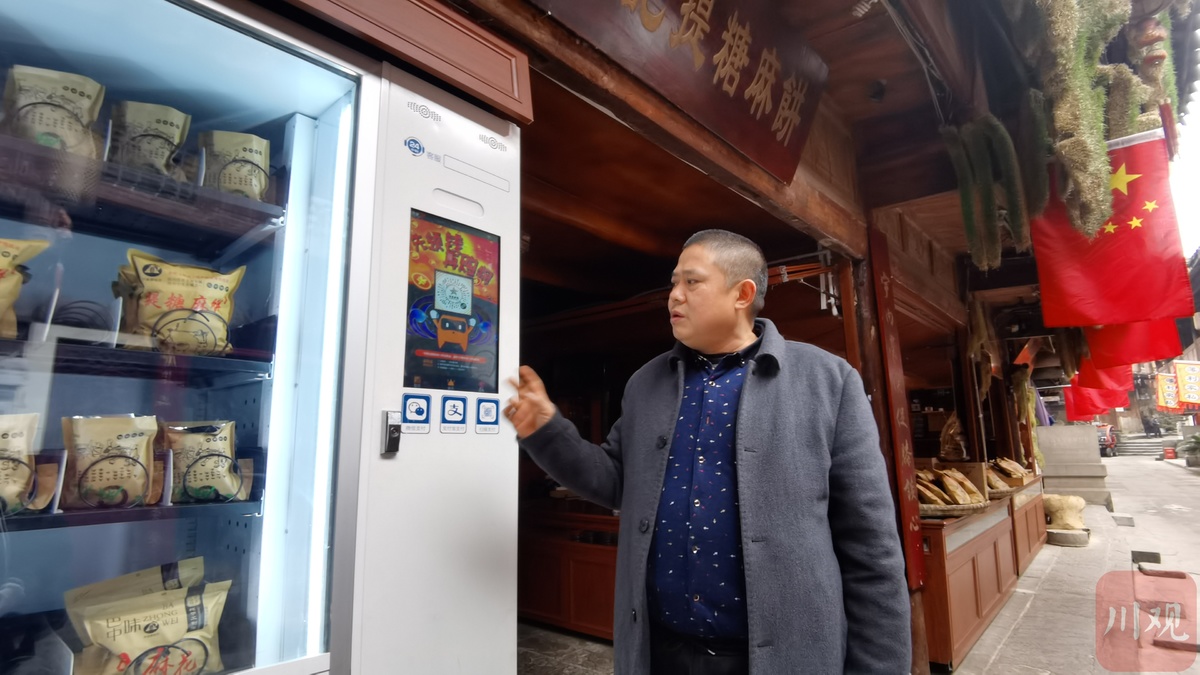 在店门口,川观新闻记者还注意到一台无人售货机,里面也放着可自助购买的提糖麻饼。“这是有一次我们在机场看到的,记下了销售电话,几天后就运了回来。”尹仲荣说,无人售货机花了1多万块,买得不算便宜,但他愿意出这钱,“我们一家现在城里买了新房,只有白天在店里,一些来得晚的游客买不到货,无人售货机就是为了他们。”