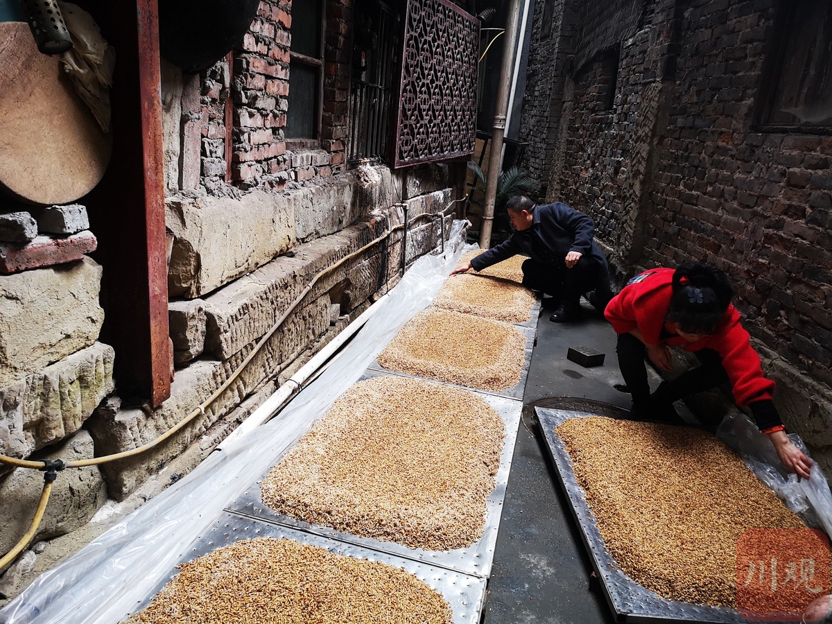 “冬天的温度太低了,还得十来天才能发芽。”2月7日一大早,趁着客人还不多,尹仲荣钻进后院,拿起水瓢给铺在铁板上的大麦浇水。他是巴中市恩阳区恩阳提糖麻饼的传人,在恩阳古镇上开店已有30余年。