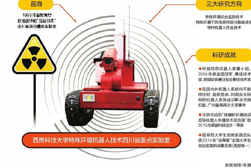 西南科技大学的特殊环境机器人技术四川省重点实验室就是研发这种机器人的佼佼者,其“强辐射环境强适应型机器人”成功处置了河南杞县、广州番禺的强放射性核辐源被卡事件,开创国内采用机器人处理此类故障先例。