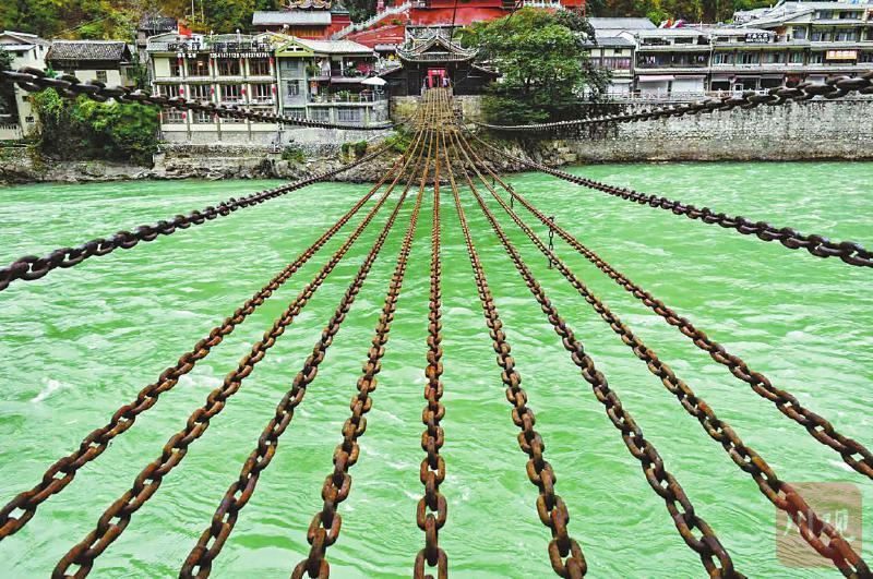 泸定桥始建于清康熙四十四年(1705年),是大渡河上建造最早最长的一座桥梁,桥身由十三根铁链组成,下边九根作为底链,两边四根作为扶手,桥长101.67米,桥宽3米,由12164个铁环组成,十三根铁链重达21吨。