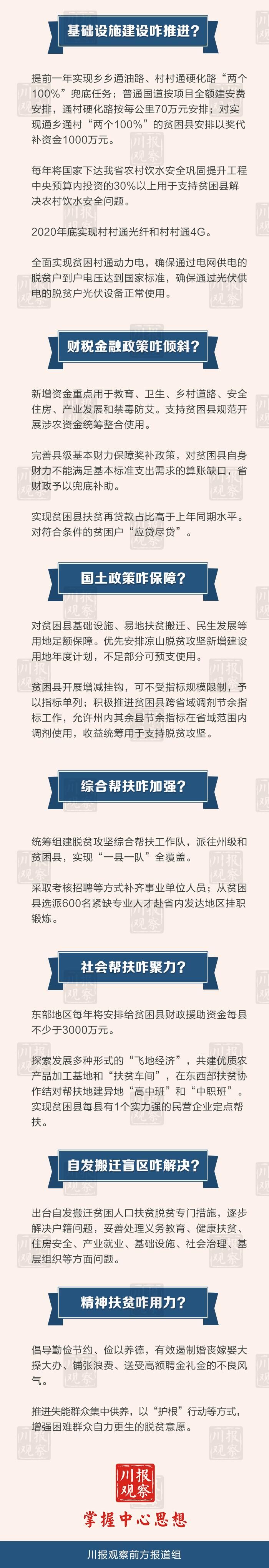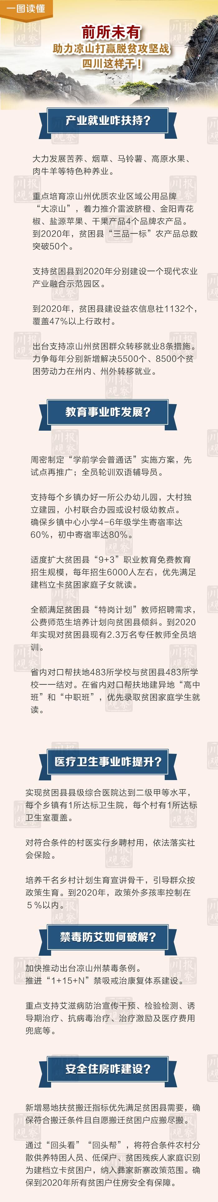 面对这样典型的贫中之贫、坚中之坚,四川省委、省政府在强化原有支持政策基础上,再次给予特殊扶持,日前出台《关于精准施策综合帮扶凉山州全面打赢脱贫攻坚战的意见》,明确了12个方面34条政策措施,力度前所未有。