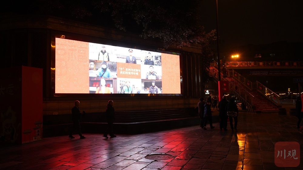“突然就感觉有年味儿!”成都市民严先生,在宽窄巷子东广场的大屏幕上,看到了《全川同屏•弹幕送祝福》的暖心视频。严先生是一枚蓉漂,来成都10年了,第一次没有回广元苍溪老家过年。“心里暖暖的,看到这么多人和我一起留在成都过年,觉得自己一下就不孤单了。”