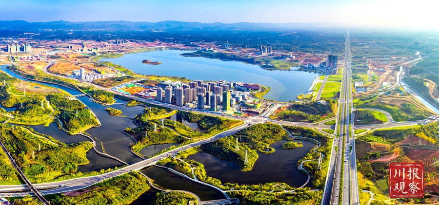 在天府新区,如今一大批世界500强企业密集落户的地方,公园美景与科研创新和谐共生。难怪有人说,行走在成都中轴线的天府大道上,如果不是川A车牌的提醒,可能一时会误认为走进了增绿版的北上广CBD,一时又进入了生态绿色度假区。